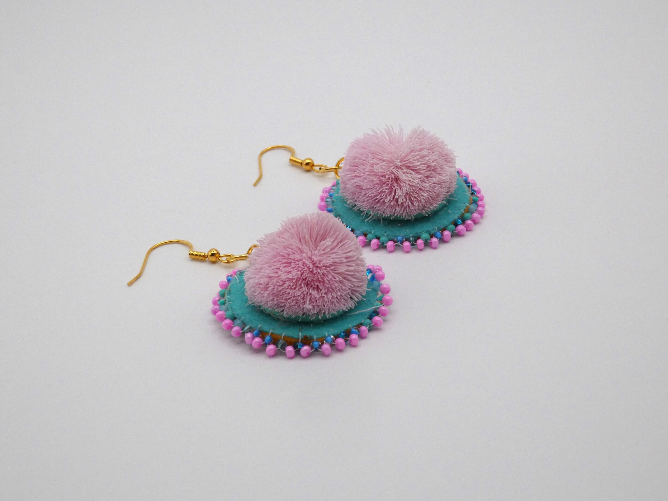 A pink pouf of caribou hair placed on turquoise beading material, surrounded by pink and blue seed bead; these earrings remind me of cotton candy!