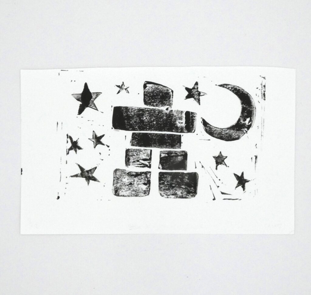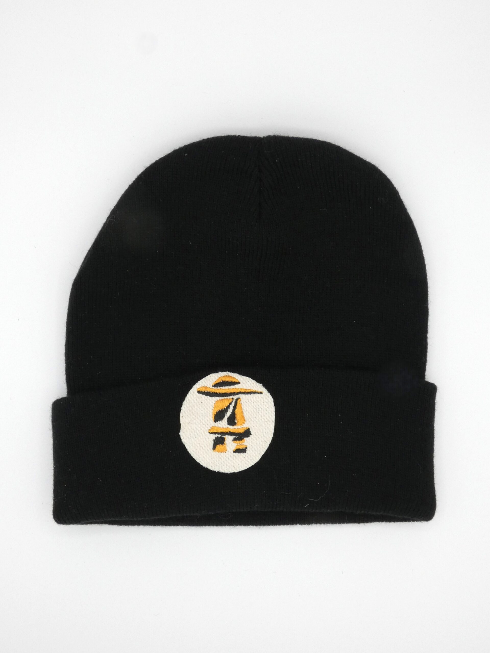 This black knit hat has a small patch with a stylized black and gold Inukshuk. This patch was created as a product of learning how to use an embroidery machine.