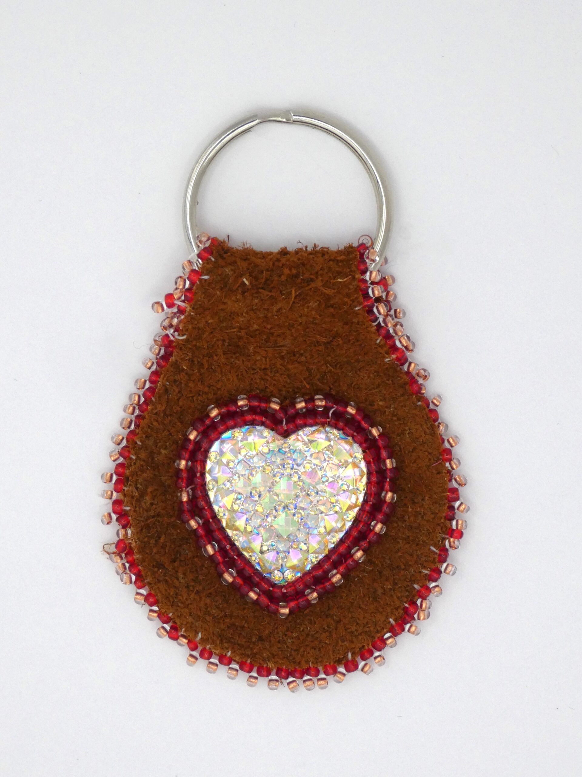 This sparkly heart key chain is both eye-catching and functional, perfect for keeping your keys organized and easy to find. It features a dazzling sparkly heart cabichon center on tobacco brown bison hide, accented with a vibrant red and champaign pink bead edging.