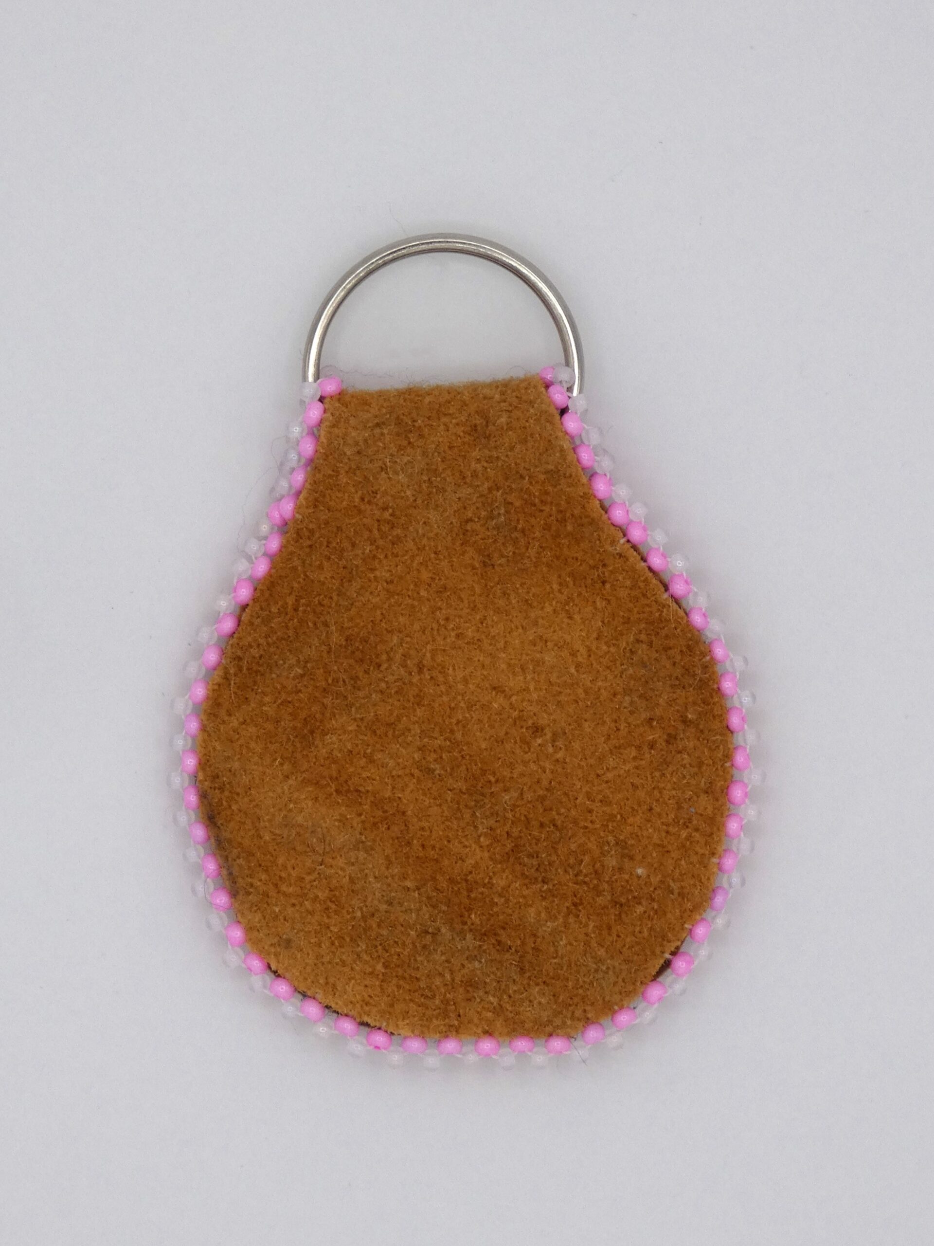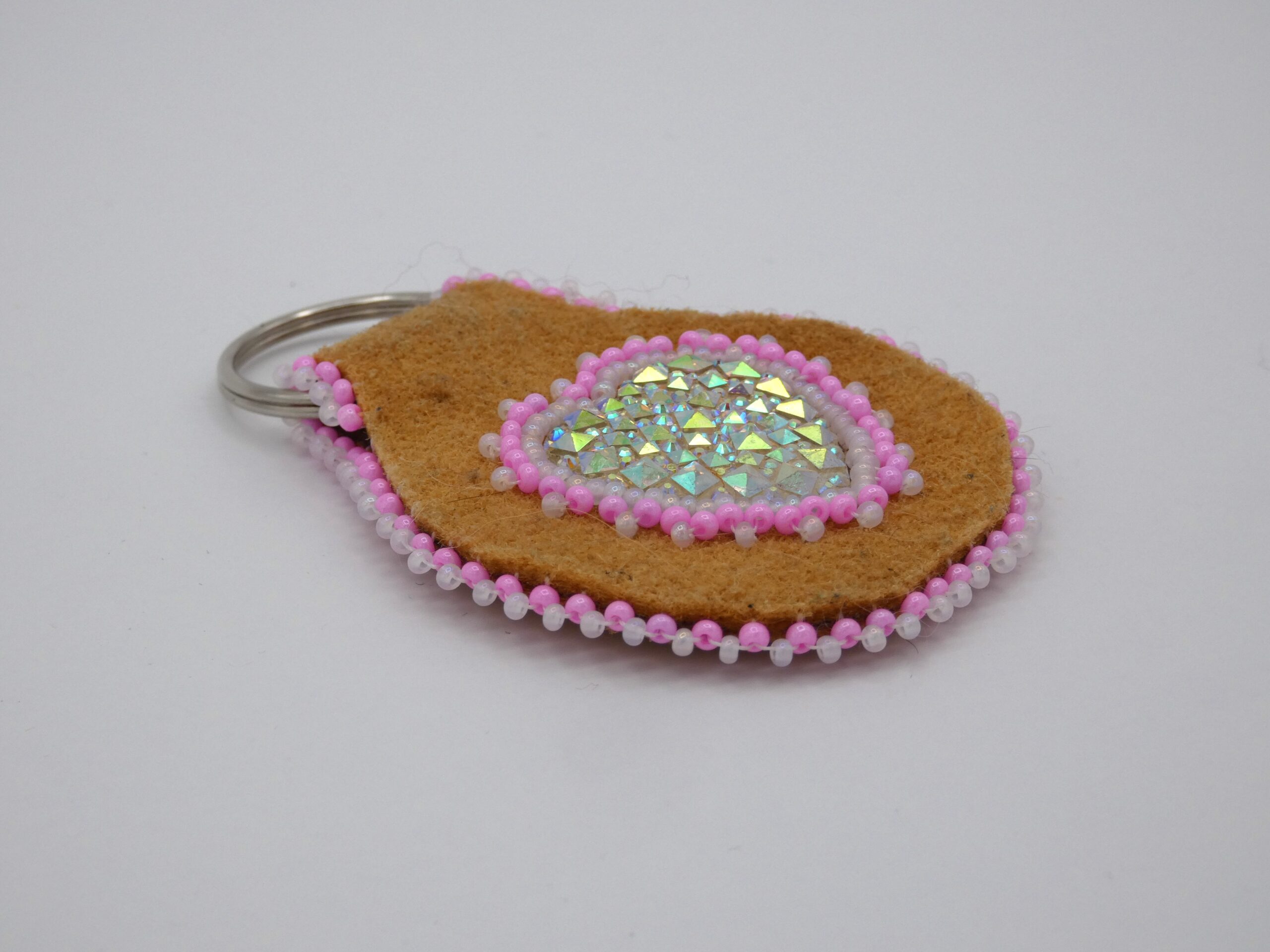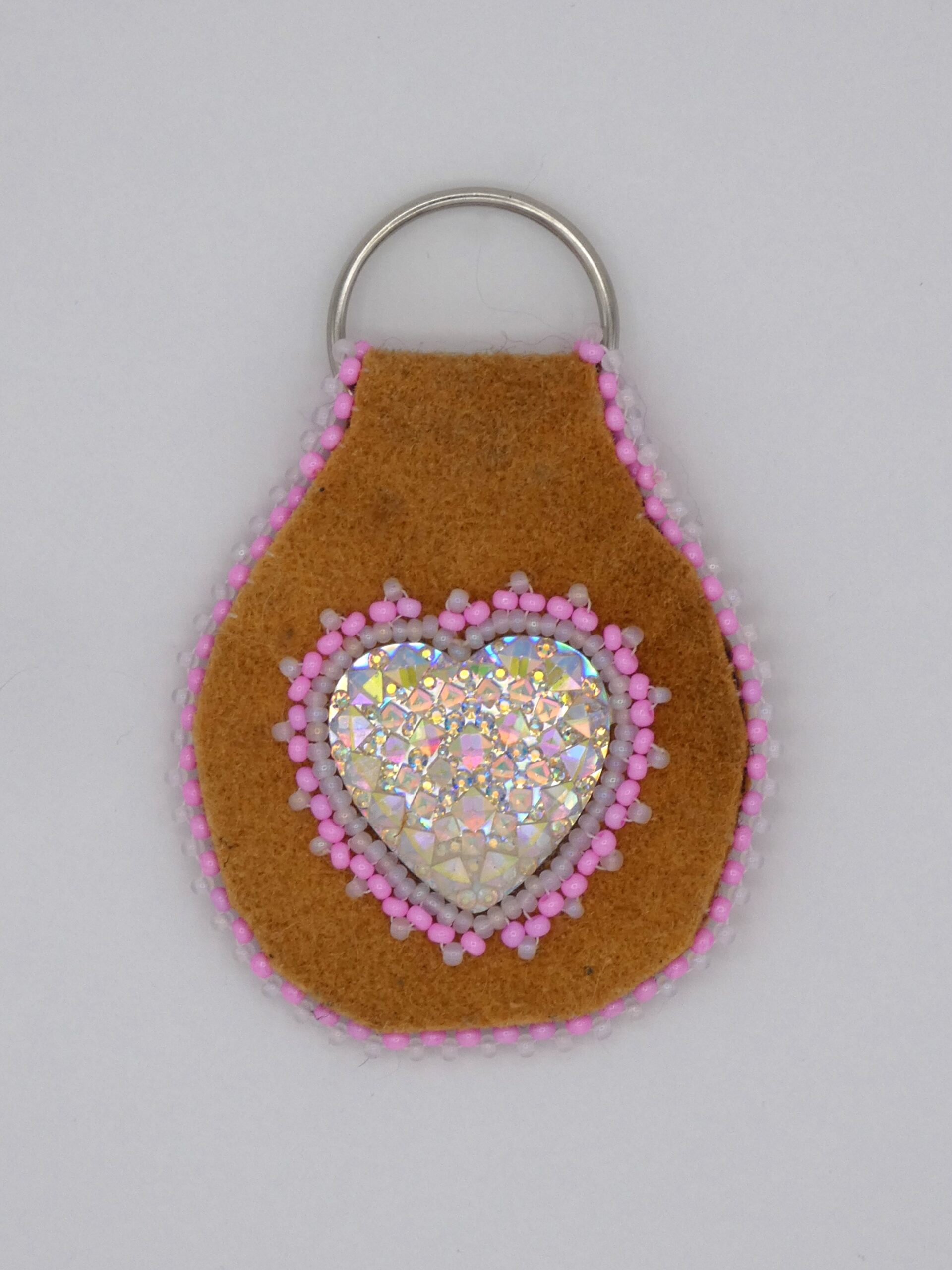 Moose hide keychain with acrylic heart cabochon and pink and white beading.