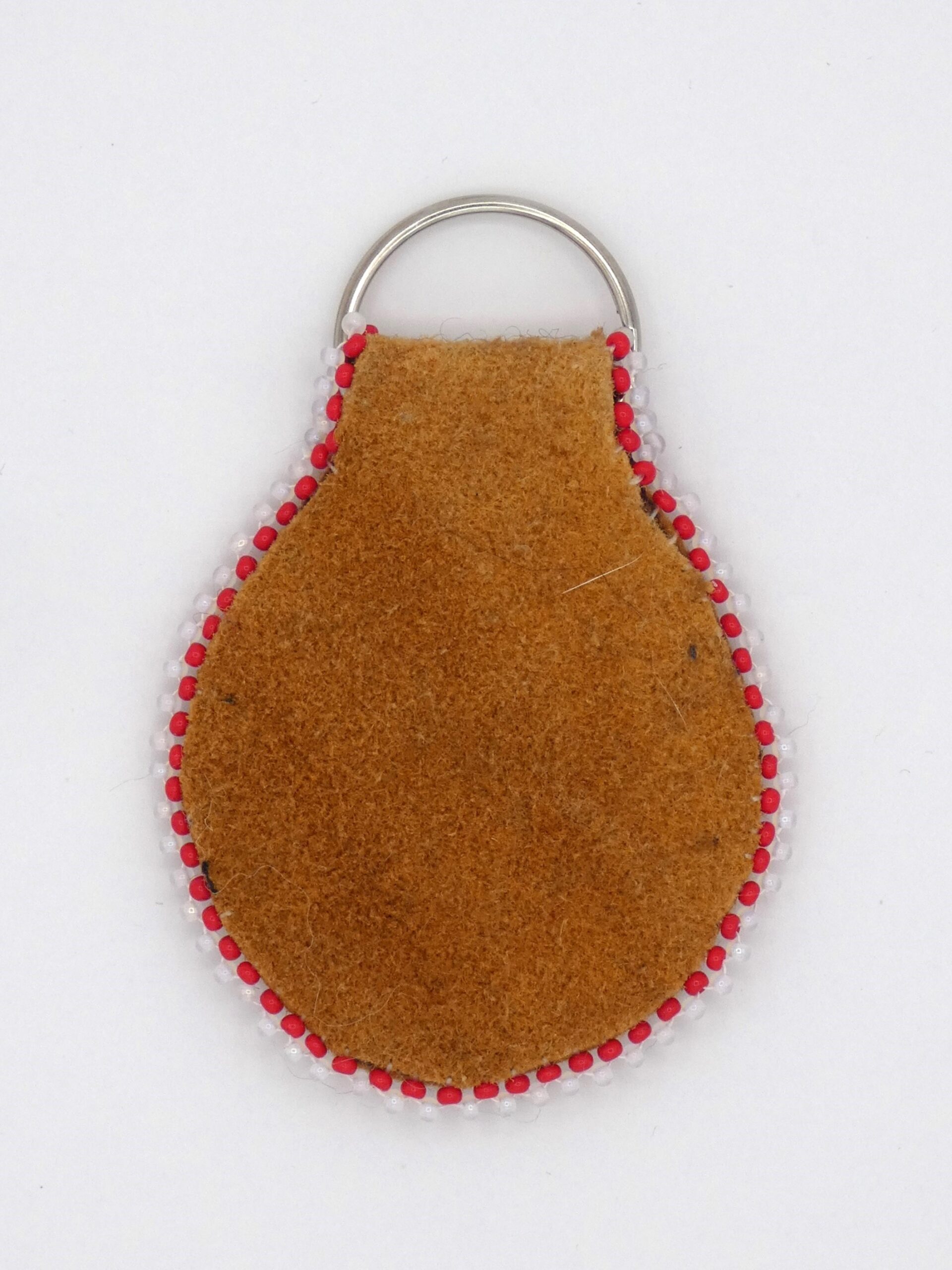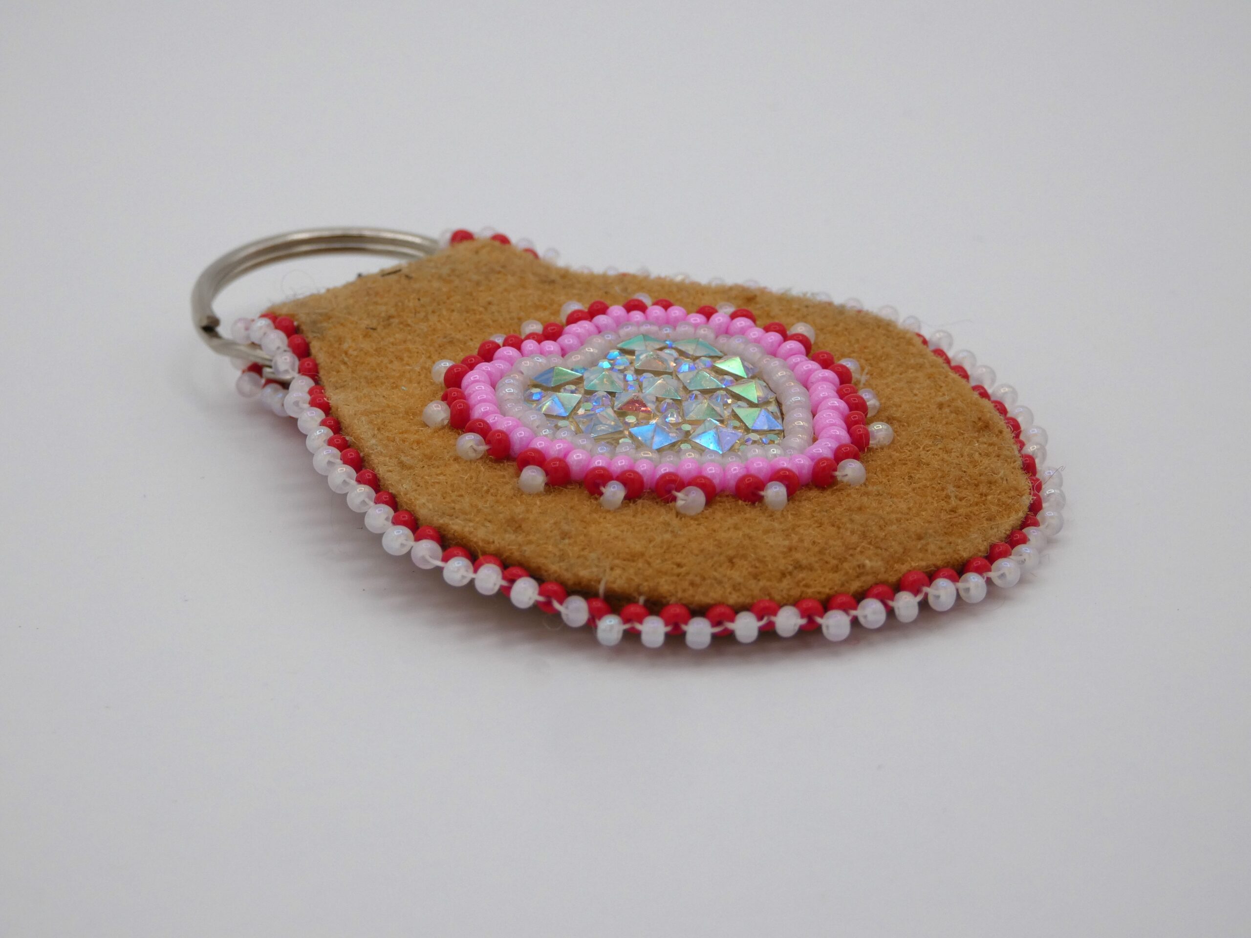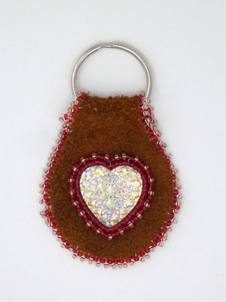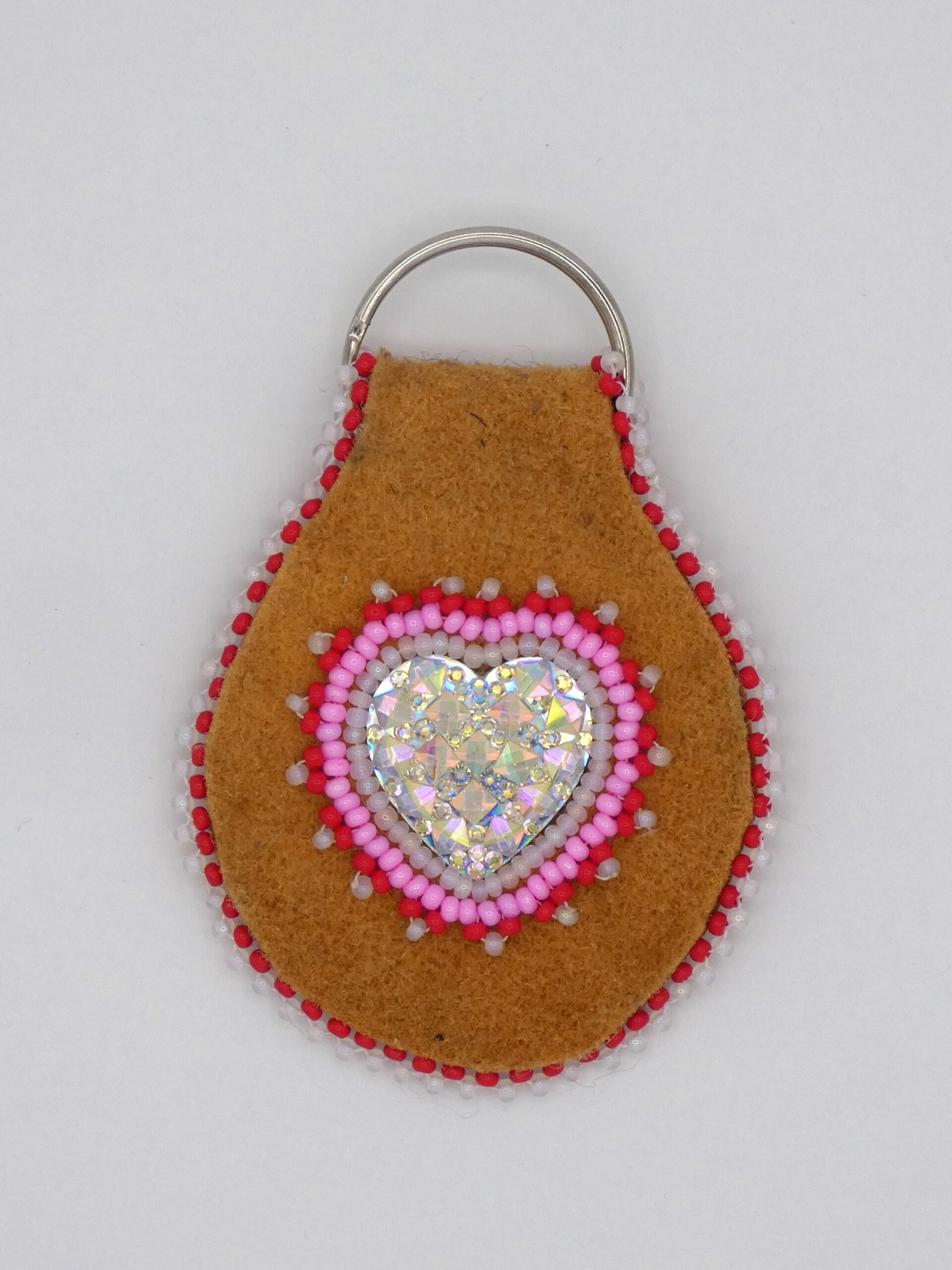 Moose hide keychain with acrylic heart cabochon and red, pink, and white beading.