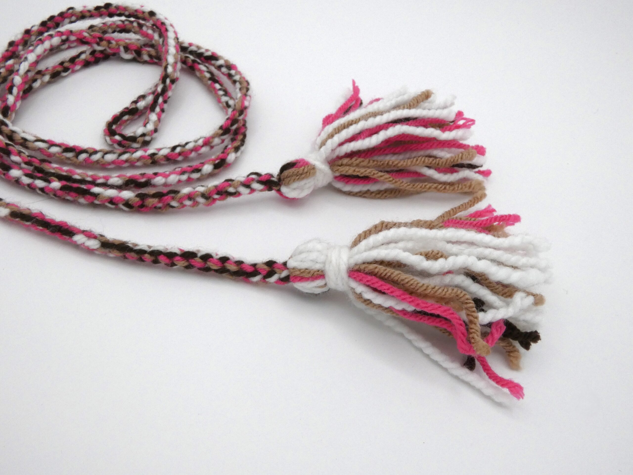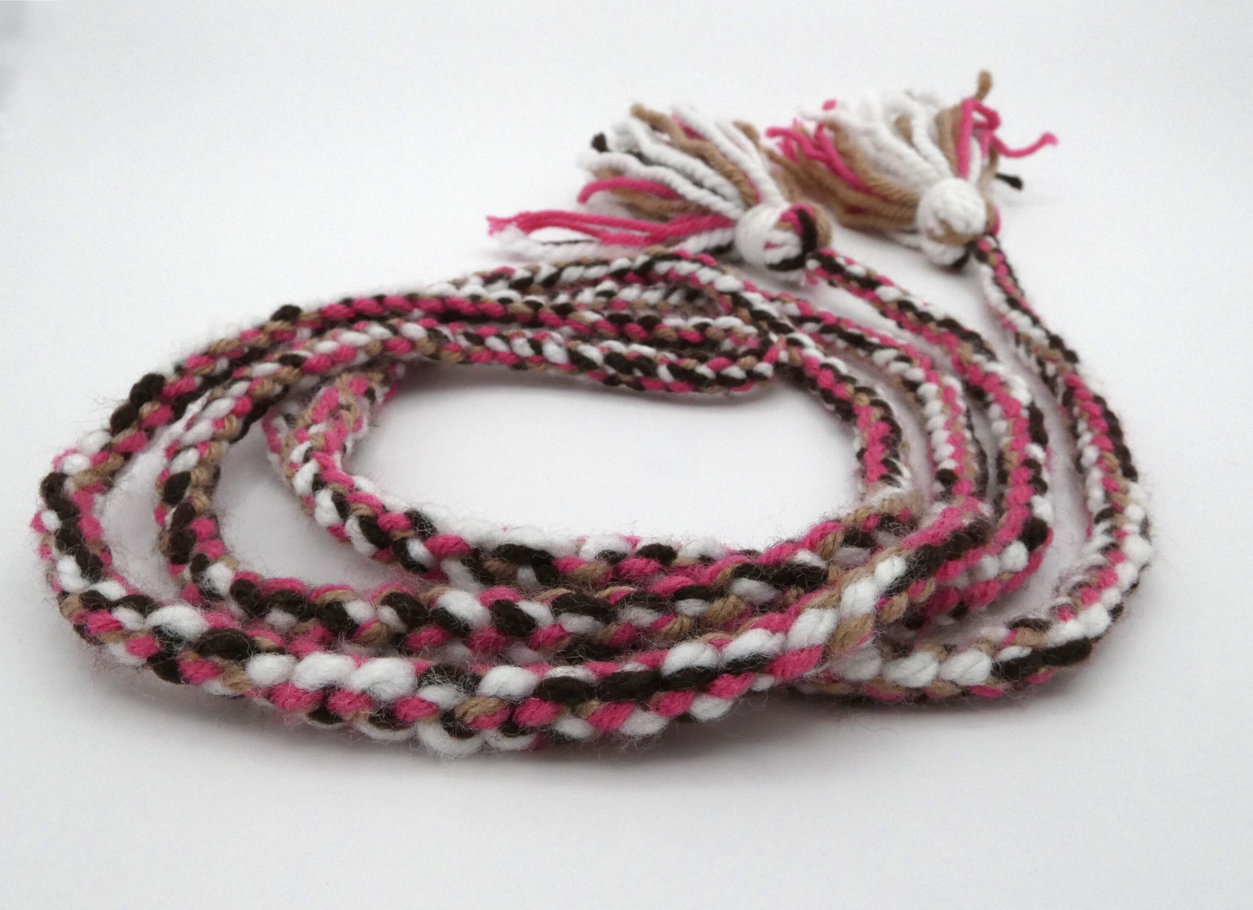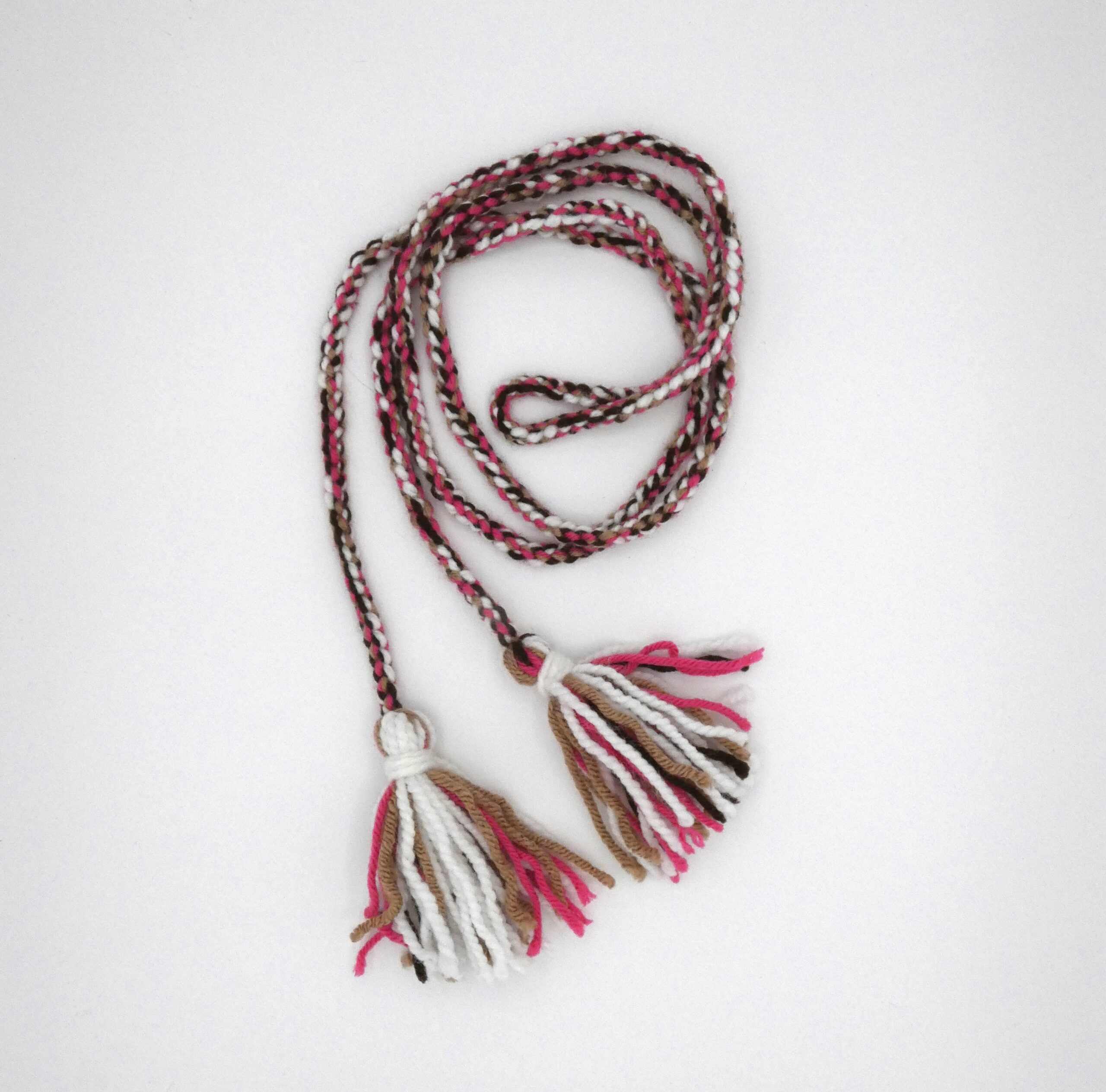 Durable, stretchy mitten strings made with knotted acrylic yarn. Excellent for keeping track of your beloved fur mitts!   From the Artist: I chose the colours after learning about colour theory. Choosing pink, brown, tan and white because I thought the colours paired nicely together. This was my first time using four colors instead of two. It's a nice process just to keep your hands busy.