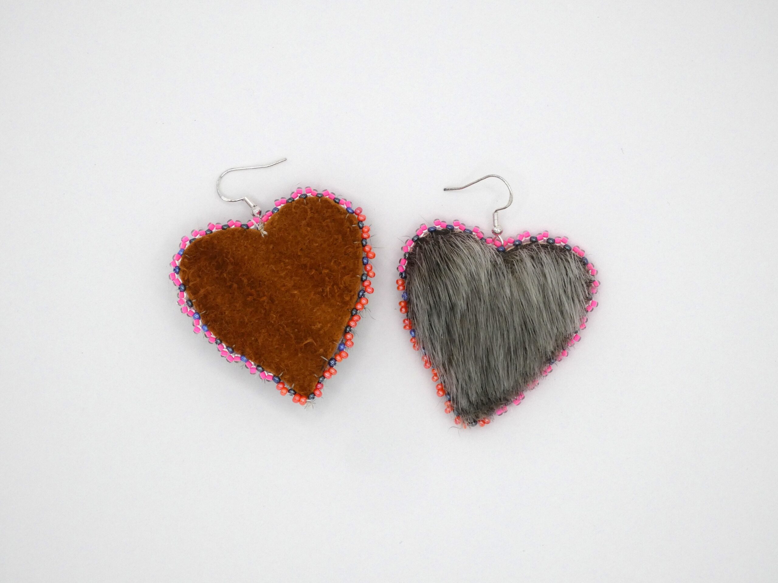Lovely earrings made of ring seal skin with tanned moose hide backing. Beautiful pink and red beads around the edge make them great to wear for Valentine's Day or a special occasion.